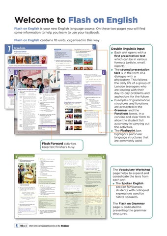 Welcome to Flash on English Flash on English is your new English language course. On these two pages you will find some information to help you learn to use your textbook. Flash on English contains 10 units, organised in this way: Double linguistic input
