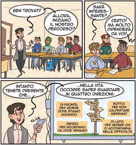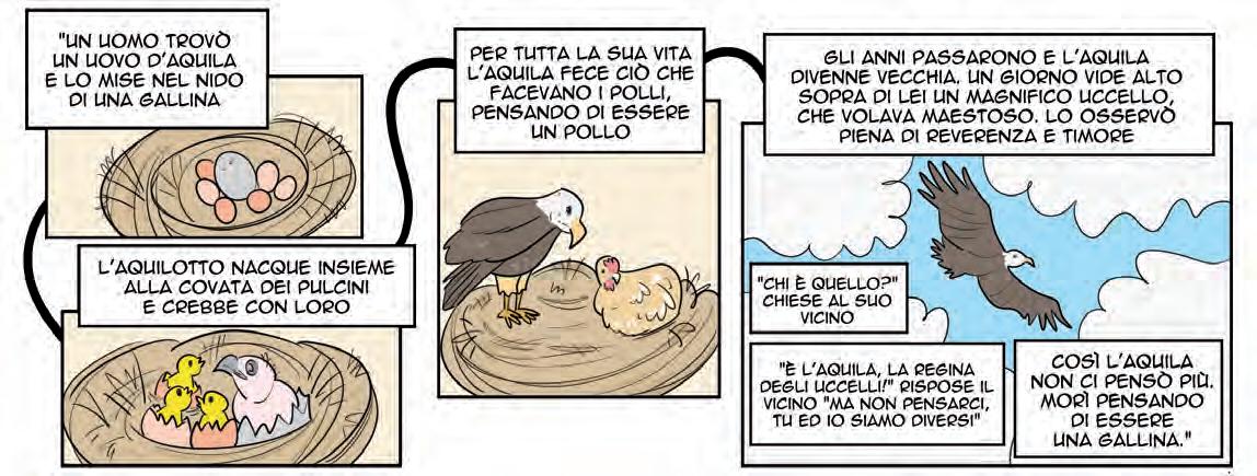 Il racconto illustrato, con cui iniziamo il nostro cammino insieme, ci ricorda quanto sia importante nella vita avere il coraggio di volare alto. Siamo chiamati ad essere aquile e non polli che volano basso confondendo l’azzurro del cielo con le dimensioni raso terra in cui, a volte, ci accontentiamo di vivere. Il conformismo, che molto spesso condiziona i nostri comportamenti, ci fa pensare e agire «come fanno tutti», accontentandoci di ruspare per terra come tanti polli e dimenticando l’aquila che è in noi, senza sollevare lo sguardo e guardare più lontano. Spesso l’omologazione può sembrare la scelta più facile e tranquilla, ma non lo è: ci lascia dentro l’amarezza e l’insoddisfazione di chi rinuncia a vivere, accontentandosi di vegetare. E allora coraggio: guardiamo in alto e iniziamo la scuola «per aquile» o perlomeno proviamo a essere sempre «il meglio di noi stessi». Non ve ne pentirete, anche se vi costerà un po’ di fatica, come tutto ciò che conta davvero.