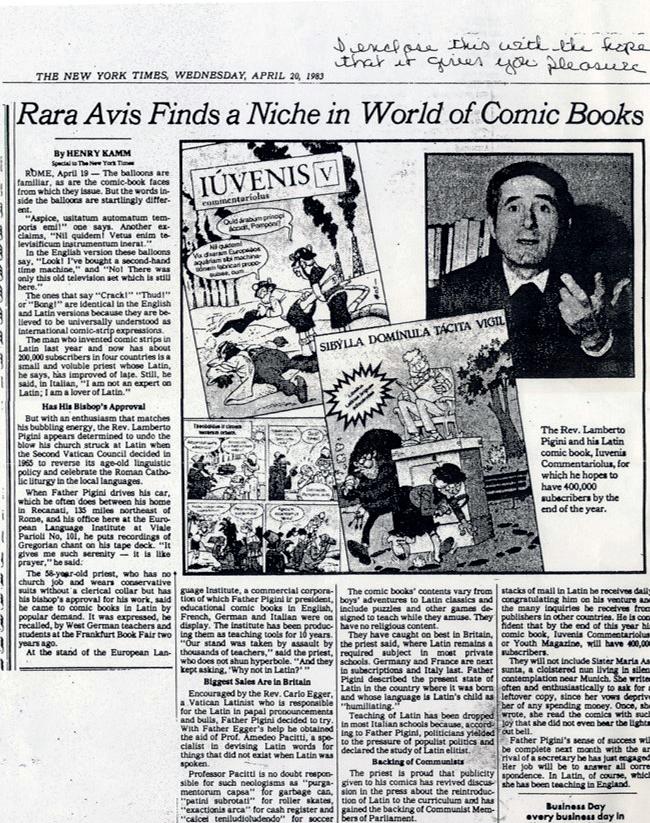 Prima che la didattica ludica diventasse di moda, don Lamberto Pigini, un prete di un piccolo paesino delle Marche, ebbe un’intuizione rivoluzionaria. Mentre i manuali usavano versioni e grammatica, lui sfidava le sue allieve e i suoi allievi con fumetti i cui personaggi litigavano, scherzavano e vivevano avventure quotidiane, il tutto in un latino vivo e parlato