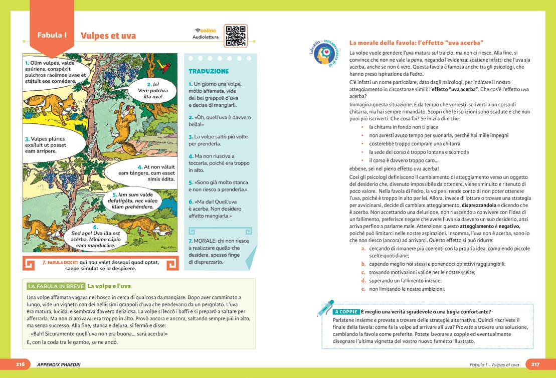 Il volume propone fumetti in latino che riadattano le favole di Fedro, tratti dalla rivista Iuvenis. Questo formato, vicino al linguaggio giovanile, rende la lettura del testo antico un’esperienza accessibile e coinvolgente.
