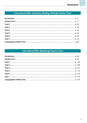 International ESOL (Listening, Reading, Writing) Practice Tests Introduction......................................................................................................................................... p. 4 Guided Test 1...................................................................................................................................... p. 11 Test 2................................................................................................................................................... p. 23 Test 3................................................................................................................................................... p. 33 Test 4................................................................................................................................................... p. 43 Test 5................................................................................................................................................... p. 53 Test 6................................................................................................................................................... p. 63 Test 7................................................................................................................................................... p. 73 LanguageCert Official Test............................................................................................................... p. 83