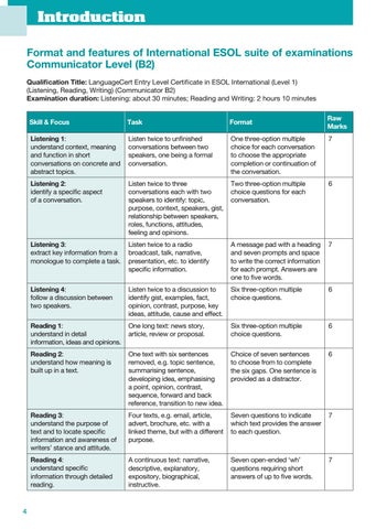 Introduction Format and features of International ESOL suite of examinations Communicator Level (B2) Qualification Title: LanguageCert Entry Level Certificate in ESOL International (Level 1) (Listening, Reading, Writing) (Communicator B2) Examination duration: Listening: about 30 minutes; Reading and Writing: 2 hours 10 minutes