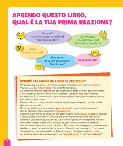 PERCHÉ HAI ANCHE UN LIBRO DI VERIFICHE? Per prima cosa, noi autrici vorremmo spiegarti il significato del termine valutare. Valutare vuol dire “dare valore”, non soltanto controllare. Se affronti le verifiche sapendo che cosa significano, forse le vedrai con occhi diversi. I tuoi insegnanti devono valutare i tuoi progressi scolastici, cioè sapere quanto hai imparato. È un loro compito, come lo è darti gli strumenti per imparare e per farti conoscere “cose” nuove. Devono farlo con costanza e sistematicità, quindi seguendo passo passo la strada che stai percorrendo. Perciò, in questo libro sono inserite verifiche su tutti i più importanti argomenti che hai studiato nel tuo sussidiario @discipline.it. Abbiamo anche fornito gli strumenti per poter valutare nel modo più oggettivo possibile il risultato delle tue verifiche. Che cosa vuol dire? Vuol dire che è stato pensato un sistema di valutazione uguale per tutti. Questo non significa che l’insegnante non terrà conto dell’impegno e degli sforzi compiuti da ogni alunno. Quando due persone si misurano la temperatura e tutti e due hanno 38, il termometro è oggettivo; forse le cause che hanno portato ad avere la febbre saranno differenti, ma lo strumento ”non mente”. Troverai gli strumenti prima delle verifiche di ciascuna disciplina: serviranno anche per aiutarti a capire da solo quali sono i tuoi “punti di forza” e i tuoi “punti deboli”.