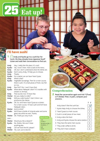 3 Sushi is small pieces of raw meat. 4 Andy orders the food. 5 Andy and Kyoko choose the same starters. 6 They have the same main course. 7 They order coffee to drink. 8 They don’t have a dessert.