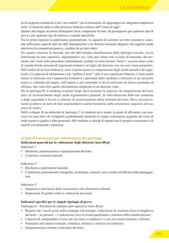 La normativa do le esigenze comunicative nei vari contesti”; per la letteratura, di raggiungere un’adeguata competenza sulla “evoluzione della civiltà artistica e letteraria italiana dall’Unità ad oggi”. Quanto alla lingua occorrerà distinguere tra le competenze di base, da presupporre per qualsiasi tipo di prova e per qualsiasi tipo di indirizzo, e quelle specifiche. Tra le prime figurano la padronanza grammaticale, la capacità di costruire un testo coerente e coeso, una sufficiente capacità nell’uso dell’interpunzione e un dominio lessicale adeguato (da saggiare anche attraverso la competenza passiva, a partire da un testo dato). Per quanto concerne le seconde, più che dell’astratta classificazione della tipologia testuale, con la distinzione tra testi espositivi, argomentativi ecc. (che può valere solo in linea di massima, dal momento che i testi reali presentano abitualmente caratteri in certa misura “misti”), occorre tener conto di caratteristiche inerenti all’argomento trattato e al taglio del discorso con cui esso viene presentato. Nell’analisi di un testo letterario, sono in primo piano la comprensione degli snodi testuali e dei significati e la capacità di interpretare e far “parlare il testo” oltre il suo significato letterale; il testo andrà messo in relazione con l’esperienza formativa e personale dello studente e collocato in un orizzonte storico e culturale più ampio; nell’analisi e nel commento si dovrà utilizzare un lessico puntuale ed efficace, che vada oltre quello abitualmente adoperato in un discorso orale. Per la tipologia B, lo studente in primo luogo deve mostrare le capacità: di comprensione del testo dato; di riconoscimento degli snodi argomentativi presenti; di individuazione della tesi sostenuta e degli argomenti a favore o contrari; di riconoscimento della struttura del testo. Deve successivamente produrre un testo di tipo argomentativo anche basandosi sulle conoscenze acquisite nel suo corso di studio. Nello sviluppo di un elaborato di tipologia C, lo studente deve essere in grado di affrontare con sicurezza un tema dato, di svilupparlo gradualmente mettendo in campo conoscenze acquisite nel corso di studi seguito o giudizi e idee personali. Allo studente si chiede di organizzare le proprie conoscenze e di esporle con proprietà e chiarezza.