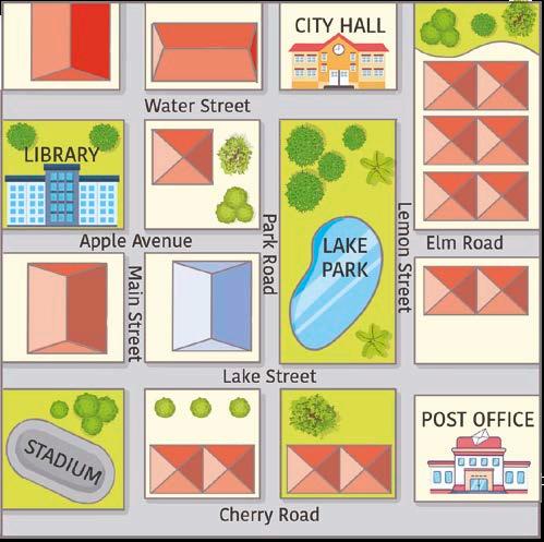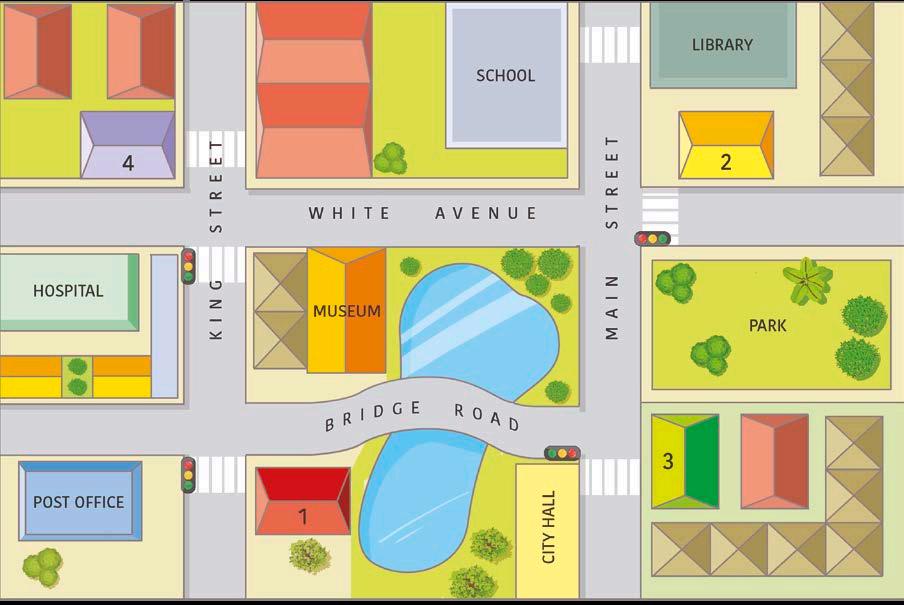 1 Look at the map and talk with a friend. How do you get to city hall from the library?