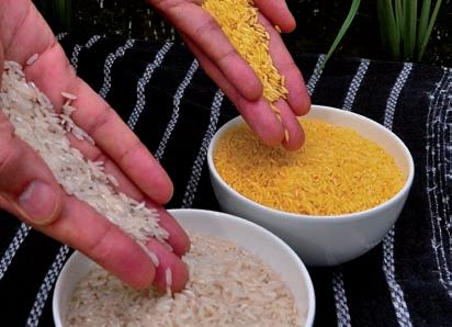 Riso tradizionale (a sinistra nella foto) a confronto con riso dorato arricchito di beta-carotene (a destra).