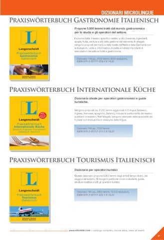 Praxiswörterbuch Gastronomie Italienisch Propone 5.000 lemmi tratti dal mondo gastronomico per lo studio e gli operatori del settore. Il volume tratta il lessico specifico relativo a cibi, bevande, ingredienti, spezie, frutta, verdura e alla della gestione del ristorante. In allegato vengono proposti dei menù e delle ricette dall’Italia e dalla Germania con le traduzioni, unite a informazioni di civiltà e indirizzi importanti di associazioni del settore hotel e gastronomia. Dizionario 116 pp., 5000 lemmi, 6000 traduzioni, ISBN 978-3-86117-209-3 € 14,90