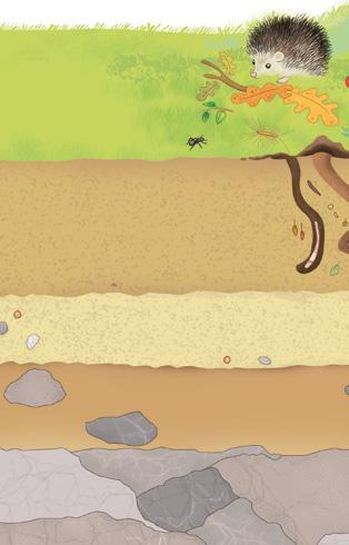 1 Individua nel disegno i cinque strati del suolo e scrivi il nome. Scegli tra: roccia madre • humus • sottosuolo • argilla • sabbia e ghiaia • lettiera