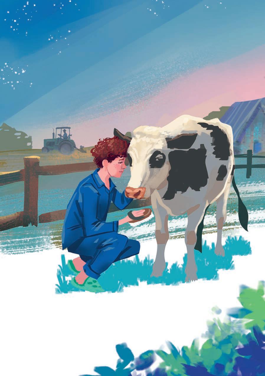 Jesse was up early and already brushing Betsy. It was still dark outside but the sun was coming up. The state fair started in less than a week so he didn’t have much time left 1 . He wanted to make sure that Betsy was perfect for the competition. She had to win! Every morning he fed her well and gave her a lot of special attention. His father was already outside driving his tractor 2 and his mother had just started preparing breakfast. He could smell the eggs and bacon and started to feel hungry.