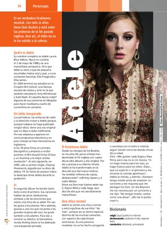 21 Su segundo álbum ha tenido tanto éxito como el primero. Sus canciones hablan de amor, desilusiones, amistad, y de las emociones que siente una chica de su edad. Por eso les gusta a los jóvenes. Pero además, gracias a una voz que recuerda a las grandes mujeres del soul, les gusta también a los adultos. Para dar a conocer su talento, la famosísima revista Rolling Stone le ha dedicado una estupenda portada.