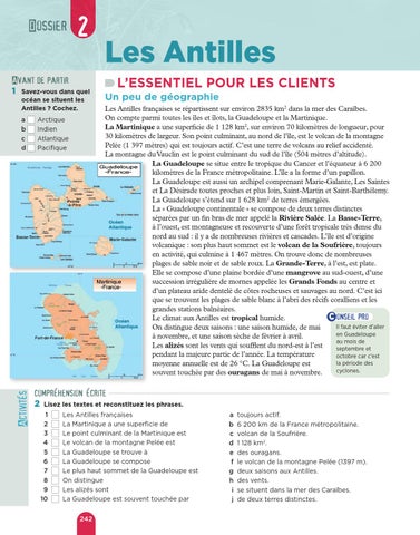 a toujours actif. b 6 200 km de la France métropolitaine. c volcan de la Soufrière. d 1 128 km2. e des ouragans. f le volcan de la montagne Pelée (1397 m). g deux saisons aux Antilles. h des vents. i se situent dans la mer des Caraïbes. j de deux terres distinctes.