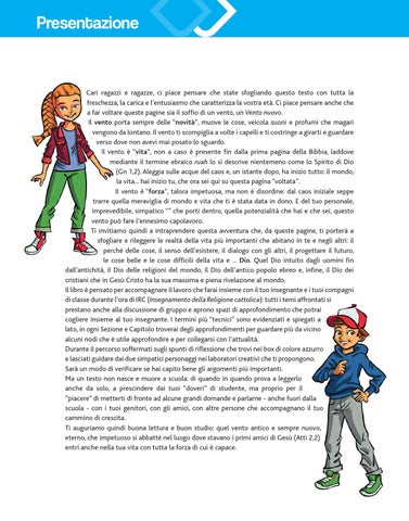 Cari ragazzi e ragazze, ci piace pensare che state sfogliando questo testo con tutta la freschezza, la carica e l’entusiasmo che caratterizza la vostra età. Ci piace pensare anche che a far voltare queste pagine sia il soffio di un vento, un Vento nuovo. Il vento porta sempre delle “novità”, muove le cose, veicola suoni e profumi che magari vengono da lontano. Il vento ti scompiglia a volte i capelli e ti costringe a girarti e guardare verso dove non avevi mai posato lo sguardo. Il vento è “vita”, non a caso è presente fin dalla prima pagina della Bibbia, laddove mediante il termine ebraico ruah lo si descrive nientemeno come lo Spirito di Dio (Gn 1,2). Aleggia sulle acque del caos e, un istante dopo, ha inizio tutto: il mondo, la vita... hai inizio tu, che ora sei qui su questa pagina “voltata”. Il vento è “forza”, talora impetuosa, ma non è disordine: dal caos iniziale seppe trarre quella meraviglia di mondo e vita che ti è stata data in dono. E del tuo personale, imprevedibile, simpatico “” che porti dentro, quella potenzialità che hai e che sei, questo vento può fare l’ennesimo capolavoro. Ti invitiamo quindi a intraprendere questa avventura che, da queste pagine, ti porterà a sfogliare e rileggere le realtà della vita più importanti che abitano in te e negli altri: il perché delle cose, il senso dell’esistere, il dialogo con gli altri, il progettare il futuro, le cose belle e le cose difficili della vita e ... Dio. Quel Dio intuito dagli uomini fin dall’antichità, il Dio delle religioni del mondo, il Dio dell’antico popolo ebreo e, infine, il Dio dei cristiani che in Gesù Cristo ha la sua massima e piena rivelazione al mondo. Il libro è pensato per accompagnare il lavoro che farai insieme con il tuo insegnante e i tuoi compagni di classe durante l’ora di Irc (Insegnamento della Religione cattolica): tutti i temi affrontati si prestano anche alla discussione di gruppo e aprono spazi di approfondimento che potrai cogliere insieme al tuo insegnante. I termini più “tecnici” sono evidenziati e spiegati a lato, in ogni Sezione e Capitolo troverai degli approfondimenti per guardare più da vicino alcuni nodi che è utile approfondire e per collegarsi con l’attualità. Durante il percorso soffermati sugli spunti di riflessione che trovi nei box di colore azzurro e lasciati guidare dai due simpatici personaggi nei laboratori creativi che ti propongono. Sarà un modo di verificare se hai capito bene gli argomenti più importanti. Ma un testo non nasce e muore a scuola: di quando in quando prova a leggerlo anche da solo, a prescindere dai tuoi “doveri” di studente, ma proprio per il “piacere” di metterti di fronte ad alcune grandi domande e parlarne - anche fuori dalla scuola - con i tuoi genitori, con gli amici, con altre persone che accompagnano il tuo cammino di crescita. Ti auguriamo quindi buona lettura e buon studio: quel vento antico e sempre nuovo, eterno, che impetuoso si abbatté nel luogo dove stavano i primi amici di Gesù (Atti 2,2) entri anche nella tua vita con tutta la forza di cui è capace.