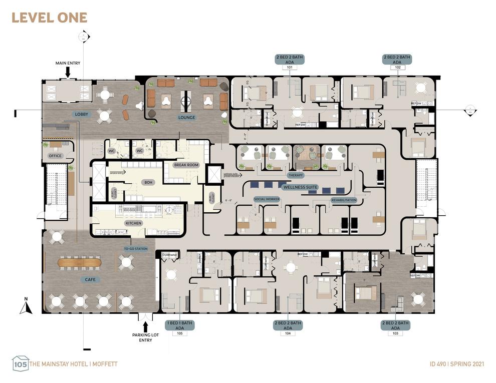 The Mainstay Hotel is part of the Cleveland Clinic in Cleveland, Ohio and welcomes cardiac patients, along with their informal caregivers into a healing and community-centered environment Informal caregivers go unseen by the healthcare community and cardiac rehabilitation is an uphill battle The Mainstay Hotel was created as a home away from home, designed based on research of healing spaces, biophilia, and different avenues of support based on need