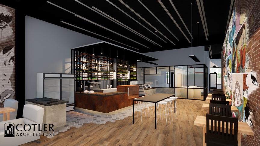 Create a custom barista counter to promote efficiency and create clear circulation to users Arcade tables and pop art wallpaper are to create a laid back environment There are nooks with casual seating and more traditional tables, giving users choice and the ability to tuck away for work.