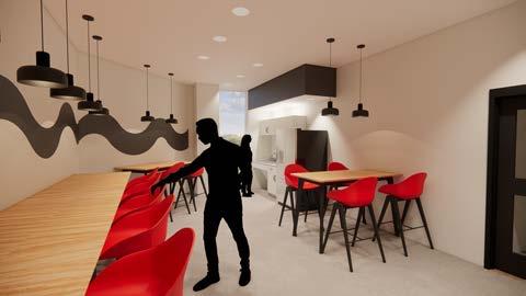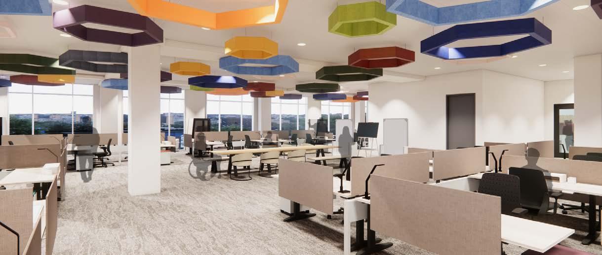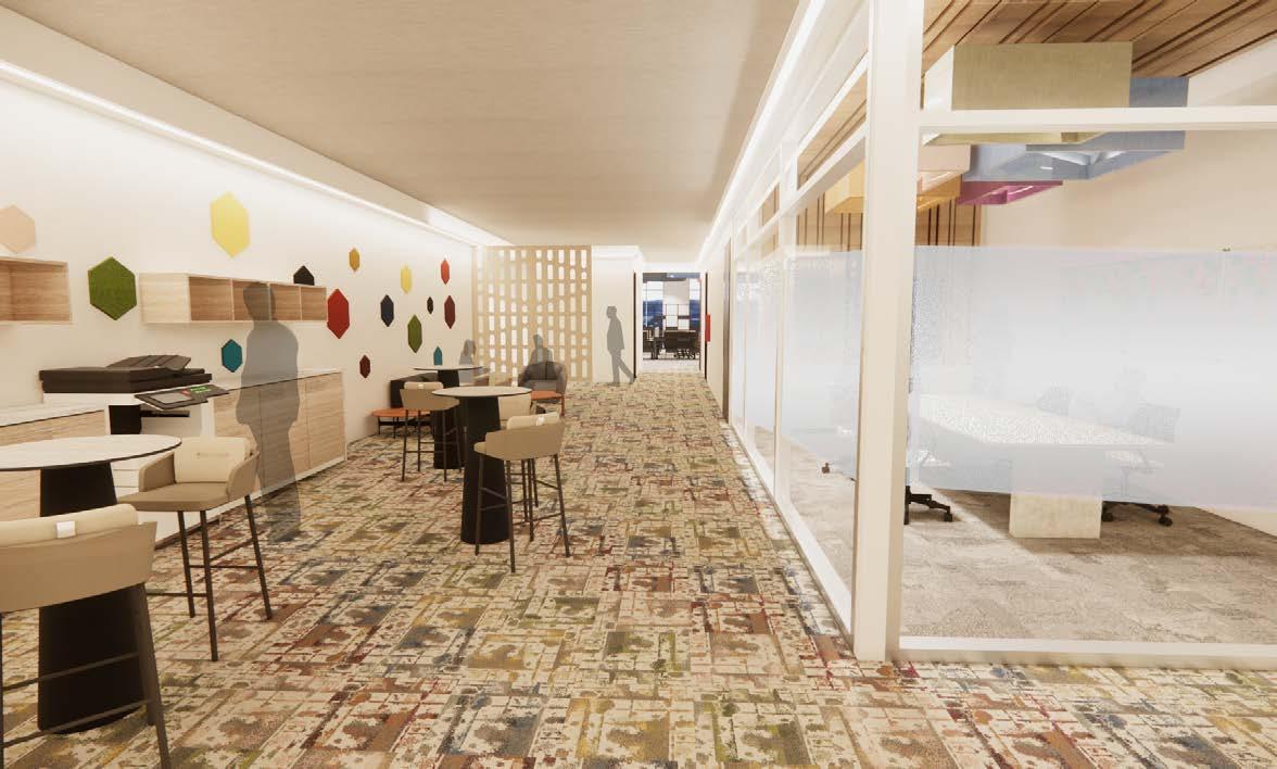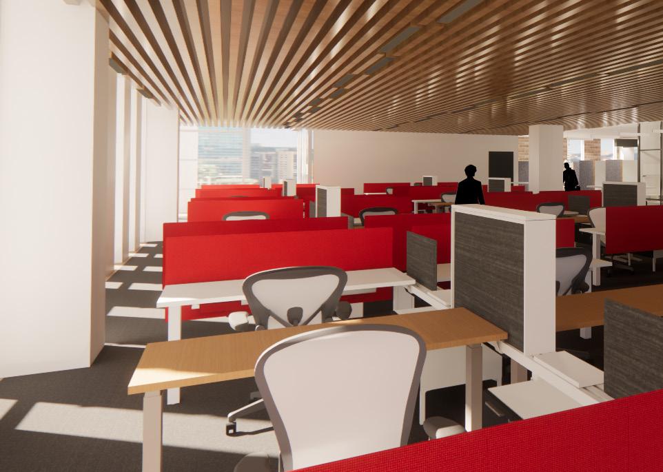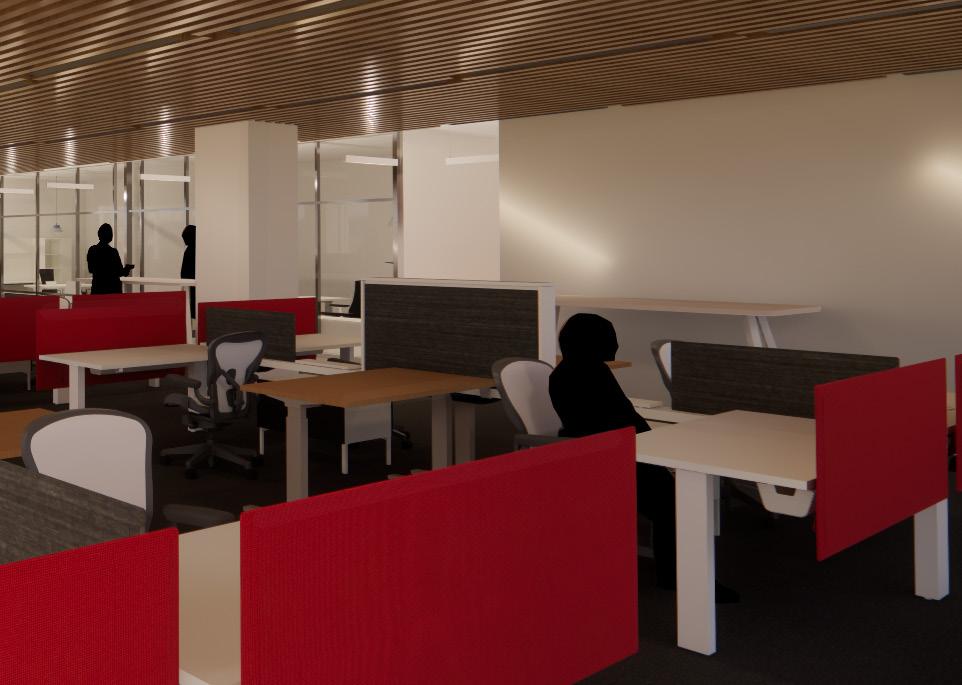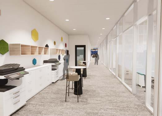 Wayfinding is enhanced through the thoughtful use of lighting, including the drop-down baffle design and pendant lights, which guide users seamlessly through the space. Acoustic lighting elements are also integrated to reduce noise and improve sound quality, positively impacting workflow and creating a more focused, comfortable environment.