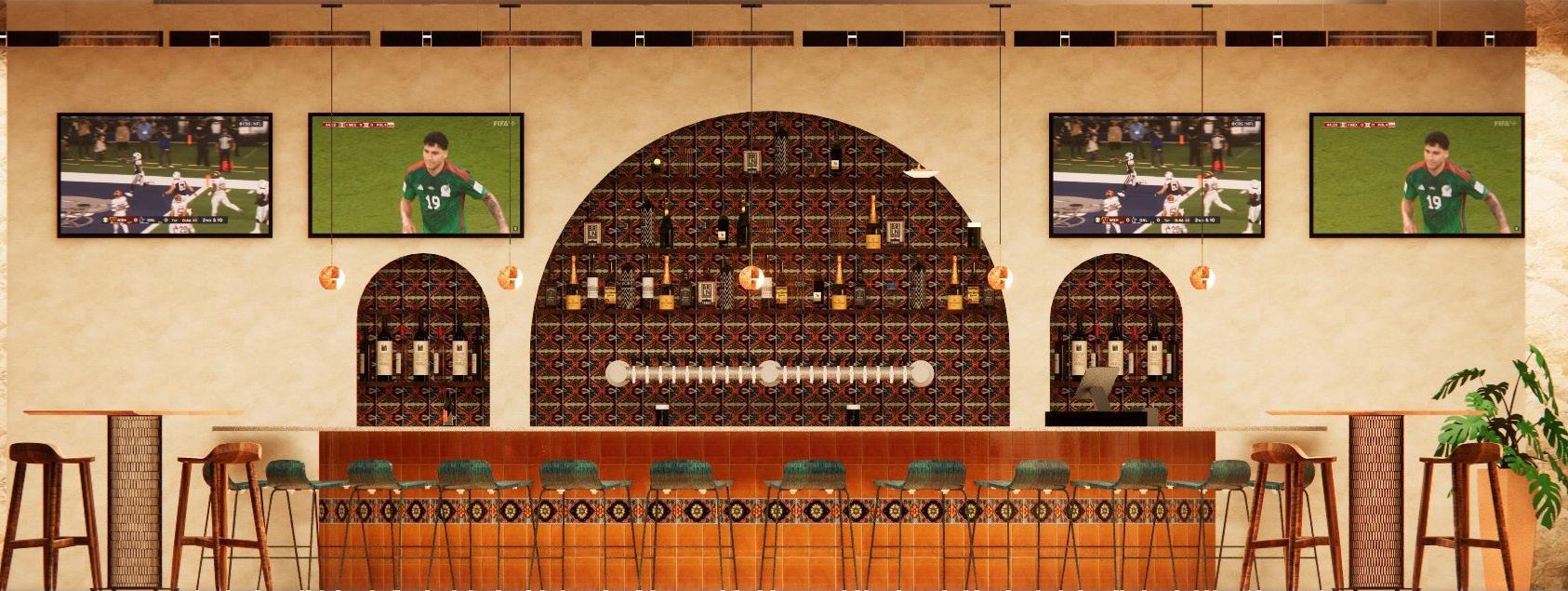 The bar radiates a message of truth to Mexican identity and ideology. It is covered in traditional materials like tzalam and teak wood, talavera tiles, chukum wall finish, and natural stone. The bar itself also speaks to the cultural importance of family and the act of sharing food and drink.