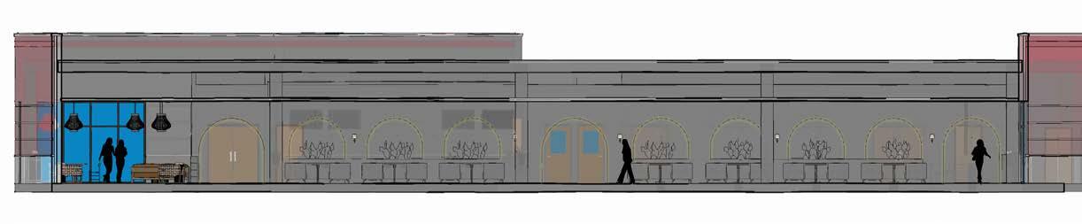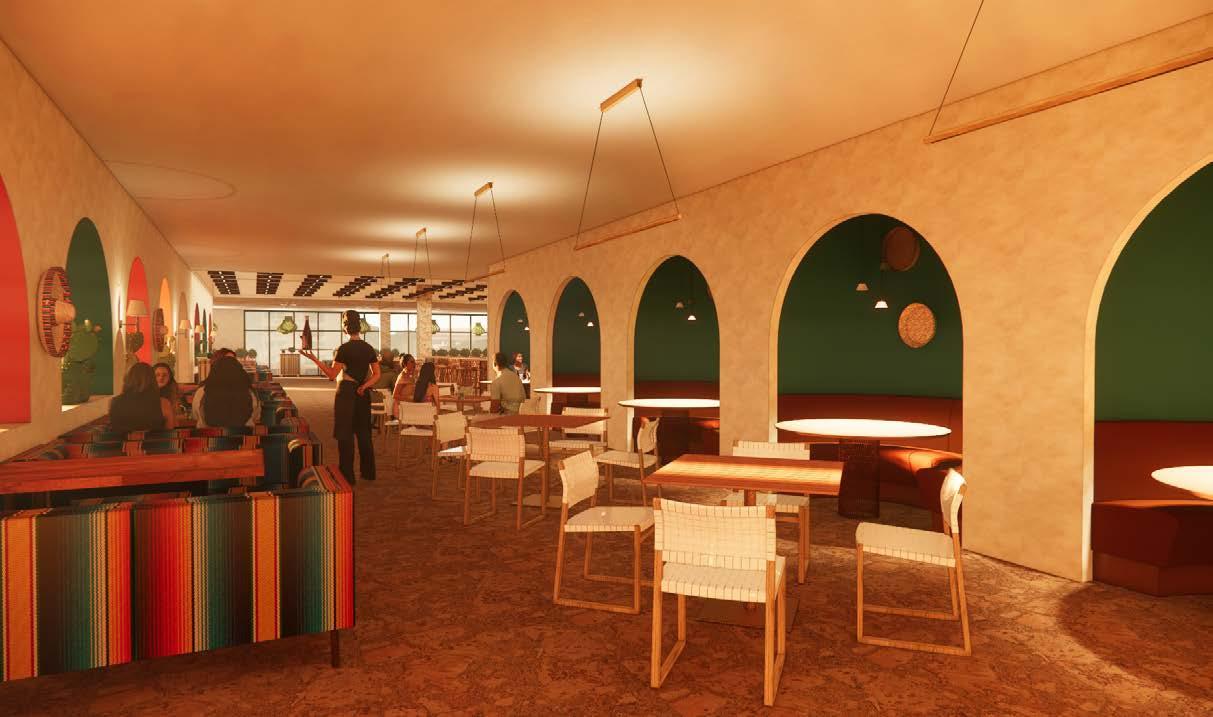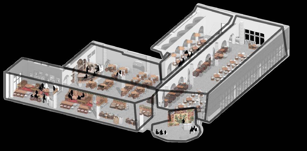 The main dining area acts as a refuge for customers. A variety of materials and arrangements are employed. Booth seating styles hug and comfort diners while surrounding them with a space that transports them to Mexico. Light penetrates profusely with the direct adjacency to the curtain wall and planters are placed within each arch that delienates the area.