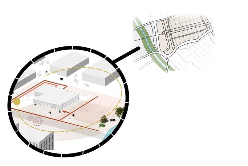 The site is located on the restaurant marketplace strip in the Trinity Groves neighborhood of Dallas, Texas. It overlooks the Dallas skyline and has a prime nature view of the Trinity River and its surrounding vegetation, offering a calm and serene environment.