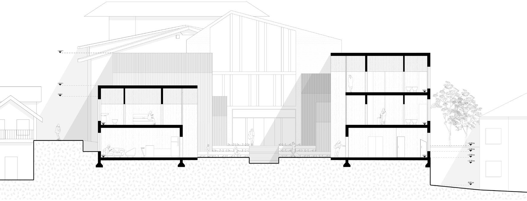 The site is located at the intersection of two central streets in the town of Sauze D'Oulx: Via del Rio and Via Colle Bourget. The project proposal introduces a complex that presents itself as opposed to the surrounding urban planning, defining an autonomous village , composed of two branches of apartments enveloping the common areas at the core. The distribution adopted within the site emphasizes the facade of the central volume, outlining a welldefined central axis through the layout of the satellite buildings. The marked symmetry dictated by the central axis is contradicted by a deliberate and accentuated difference between the heights of the satellite buildings.