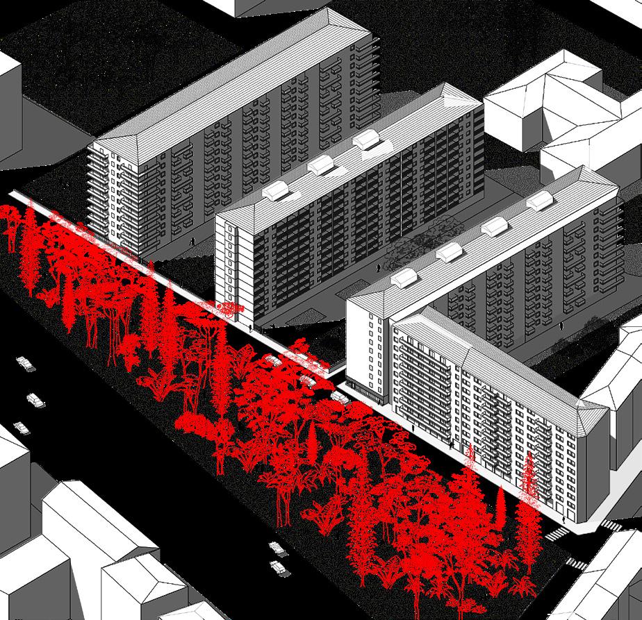 The redevelopment intervention for these artifacts preserves the supporting framework of the buildings and is expressed through the addition of new external structures that mark the facades, creating a whole new image, even the space of the apartments is radically changed.