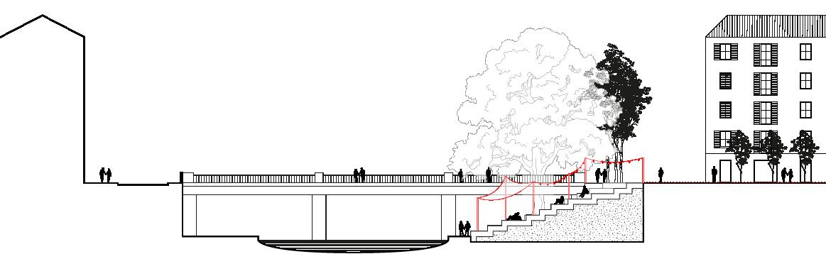 In this case, the transformation of the space responds to a desire to give a public dimension to the water, over which functions and activities of public and social relevance already present in the area are extended. This appropriation of the space on the water, allowed by the specific characteristics of this section of the river and its solid side walls, takes place through an interaction of forms that create points of tension between different views and different proportions, and is materialised with floating devices anchored to the banks, in order to create real floating squares.