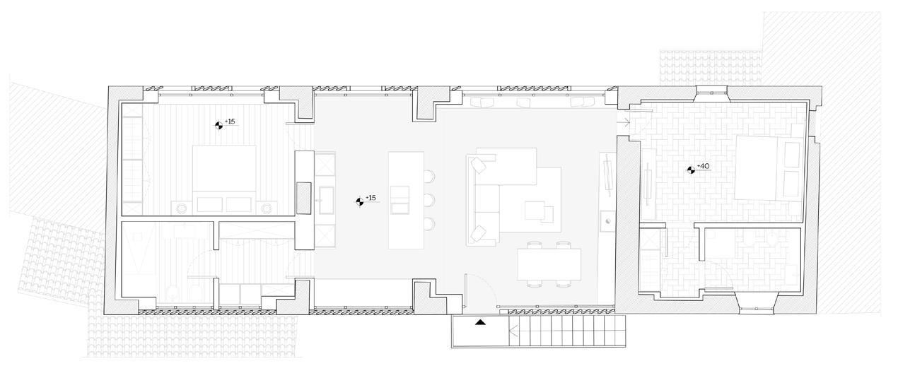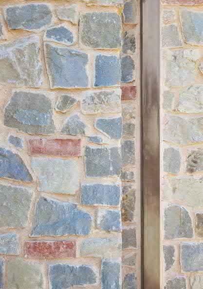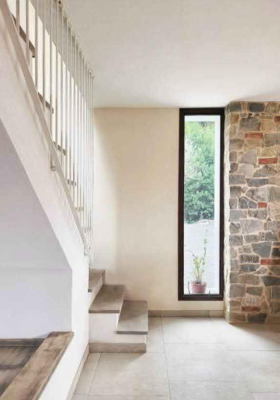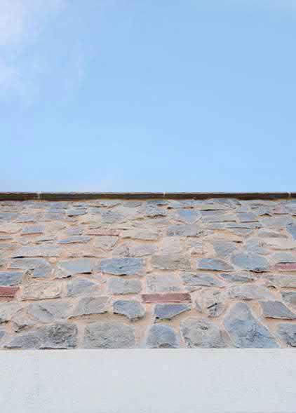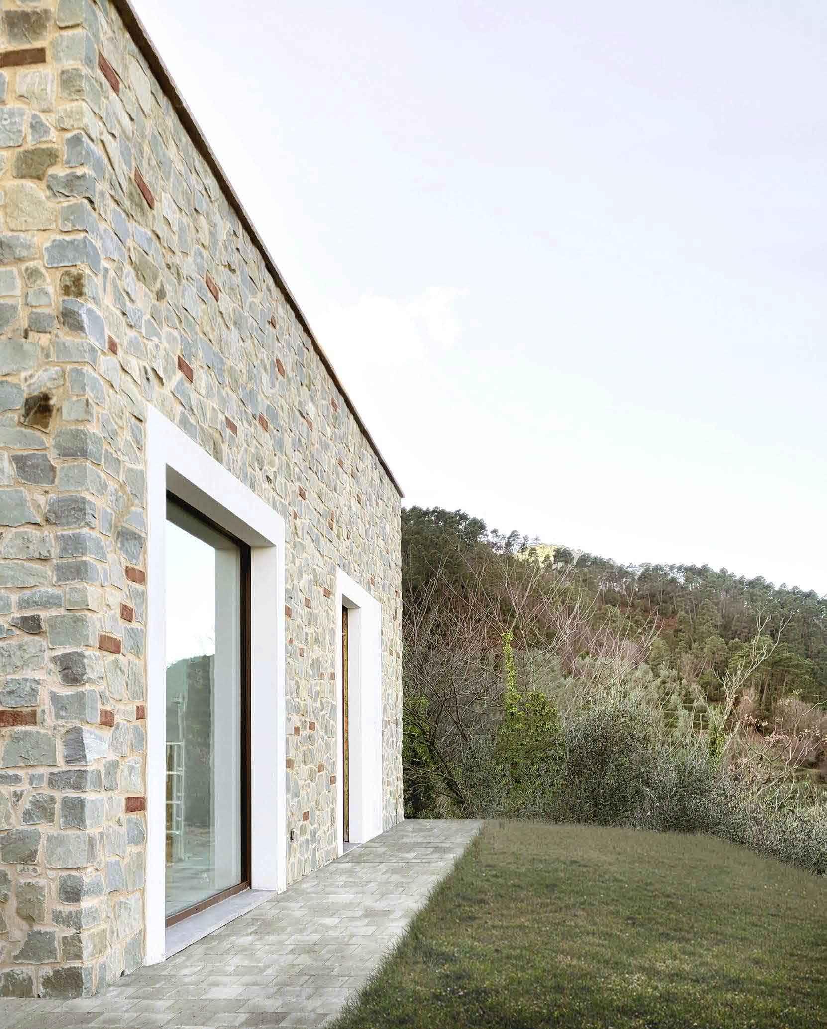 The more rural character of the new volume, therefore, acts as a counterpoint to the neutral and clean surface of the existing building, and somehow recalls the dry stone walls typical of the area, almost resembling from a distance a masonry terrace, not difficult to see in the olive groves that dot the hill.