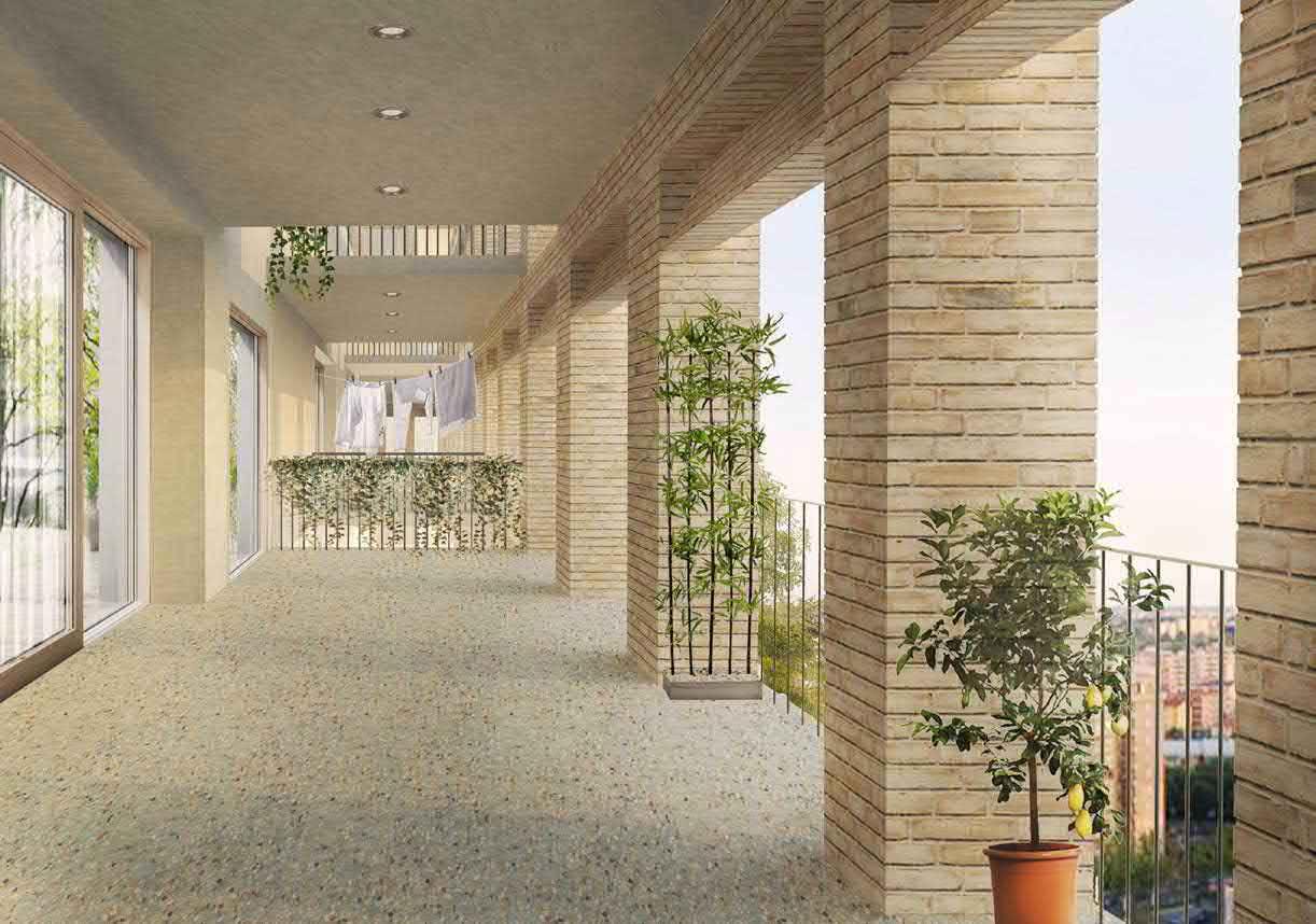 Every apartment unit has access to an outdoor private area, resulting in a series of balconies that create a system of “voids”, visually and spacially interconnected, creating a permeable, fluid and organic double skin that embraces the building. This configuration takes inspiration from the traditional “ballatoio”, that used to characterize the “case di ringhiera”, a typical milanese housing type, identified by a sense of openness and partecipation towards the “other”, generating a sense of communion and collectivity.