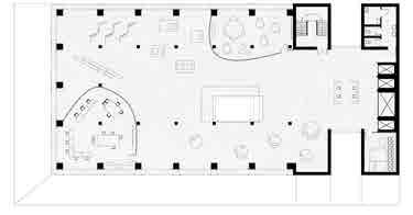 La disposition en façade de la structure permet à l’ensemble des plateaux d’offrir une liberté scénographique. Certains éléments fixes comme les circulations, les sanitaires ou encore l’espace de conférence permettent une stabilité de la machine. L’étage intermédiaire est complètement ouvert aux possibles différents programmes. Celui-ci rythme l’ensemble du système fixe mobile