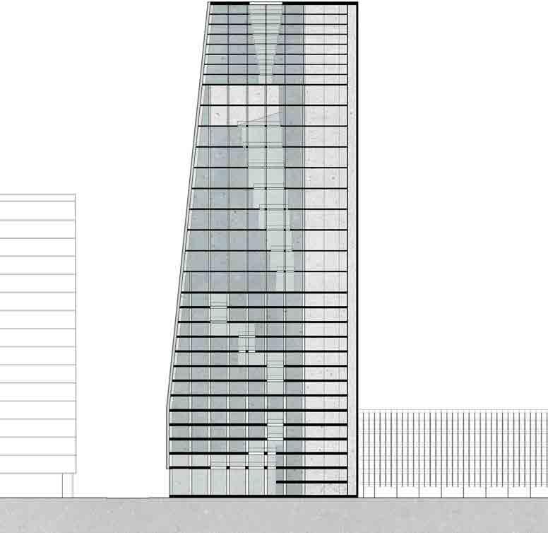 Le projet de Chapel Street se situe à Liverpool dans la rue portant son nom. La volonté est d’offrir un espace regroupant différentes activités tout en s’harmonisant dans le quartier d’affaire. On retrouve un rezde-chaussée ouvert sur la ville, suivis de plusieurs étages de bureaux, puis une dizaine dédiés au culturel. On retrouve au chapeau de la tour plusieurs logements. Chaque partie très distincte se rassemble autour de vide, afin de relier et d’offrir un contact spécial entre les différents étages des fonctions. La forme permet de suivre l’évolution programmatique et de capter le maximum de soleil dans cette région anglaise. On retrouve les espaces de circulation au fond du bâtiment comme détaché de celui-ci, afin d’offrir des plateaux libres visuellement et spatialement.