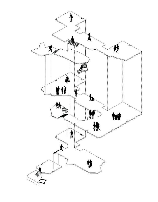 The existing main levels, as well as the residential levels above, are connected through the existing elevator. The mezzo levels will be connected through staircases and intermediary elevators to allow for accessibility.