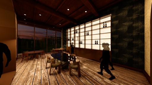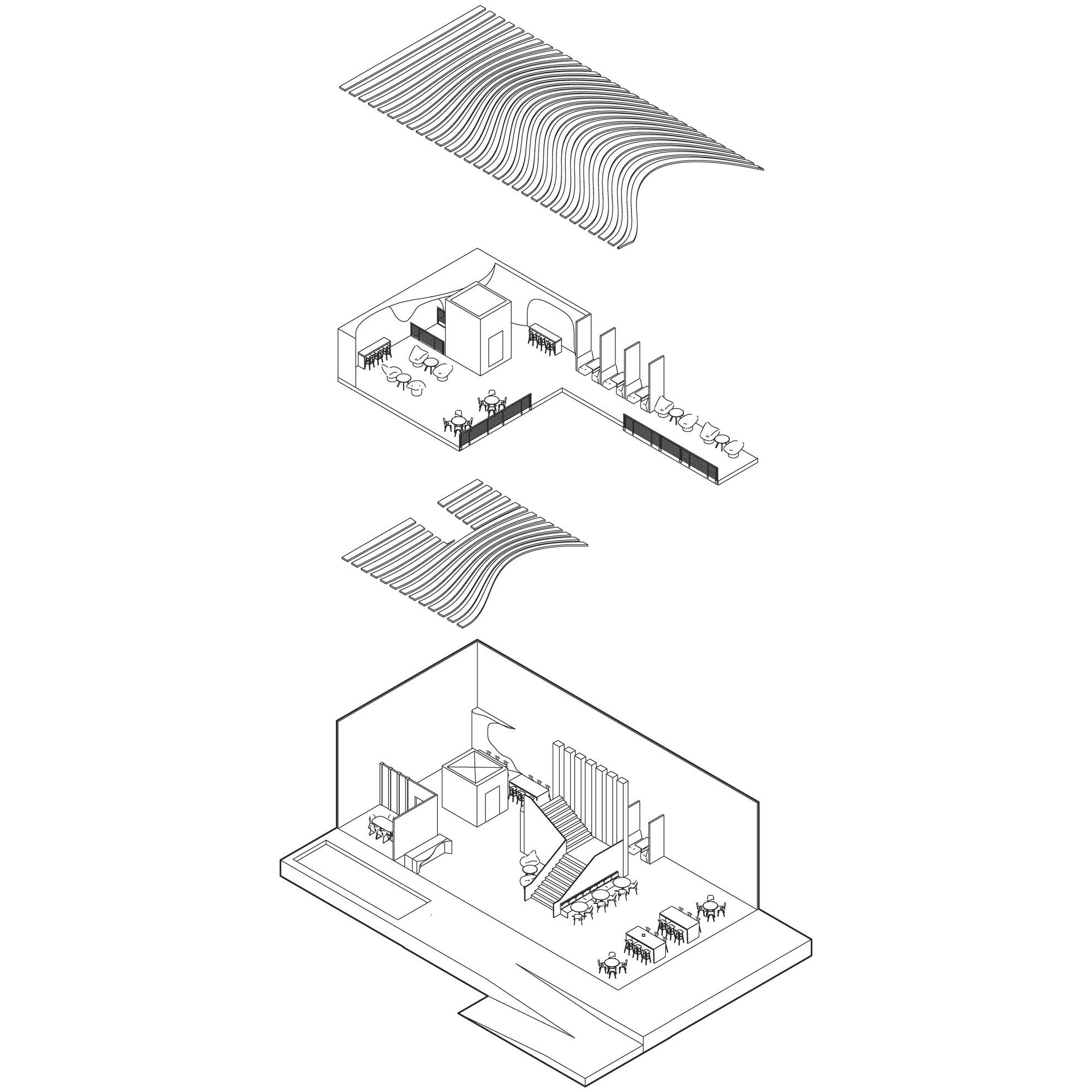 The aesthetic concept behind Ebb & Flow is rooted in the opposing dynamic between the natural and the built environments of the Pacific Northwest. The sweeping form of the second story and the waves in the wooden ceiling beams are nodes to the ebbs and flows of the Puget Sound tide. Inspiration from the Seattle skyline can be found in the hierarchy and rectilinearity of the elevator shaft, the staircase, and the booth seating Seattle is infamous for both its breathtaking natural scenery and its expansive skyline, and the struggle for a hierarchy between natural and man-made opens up a deeper insight into the culture of the Pacific Northwest