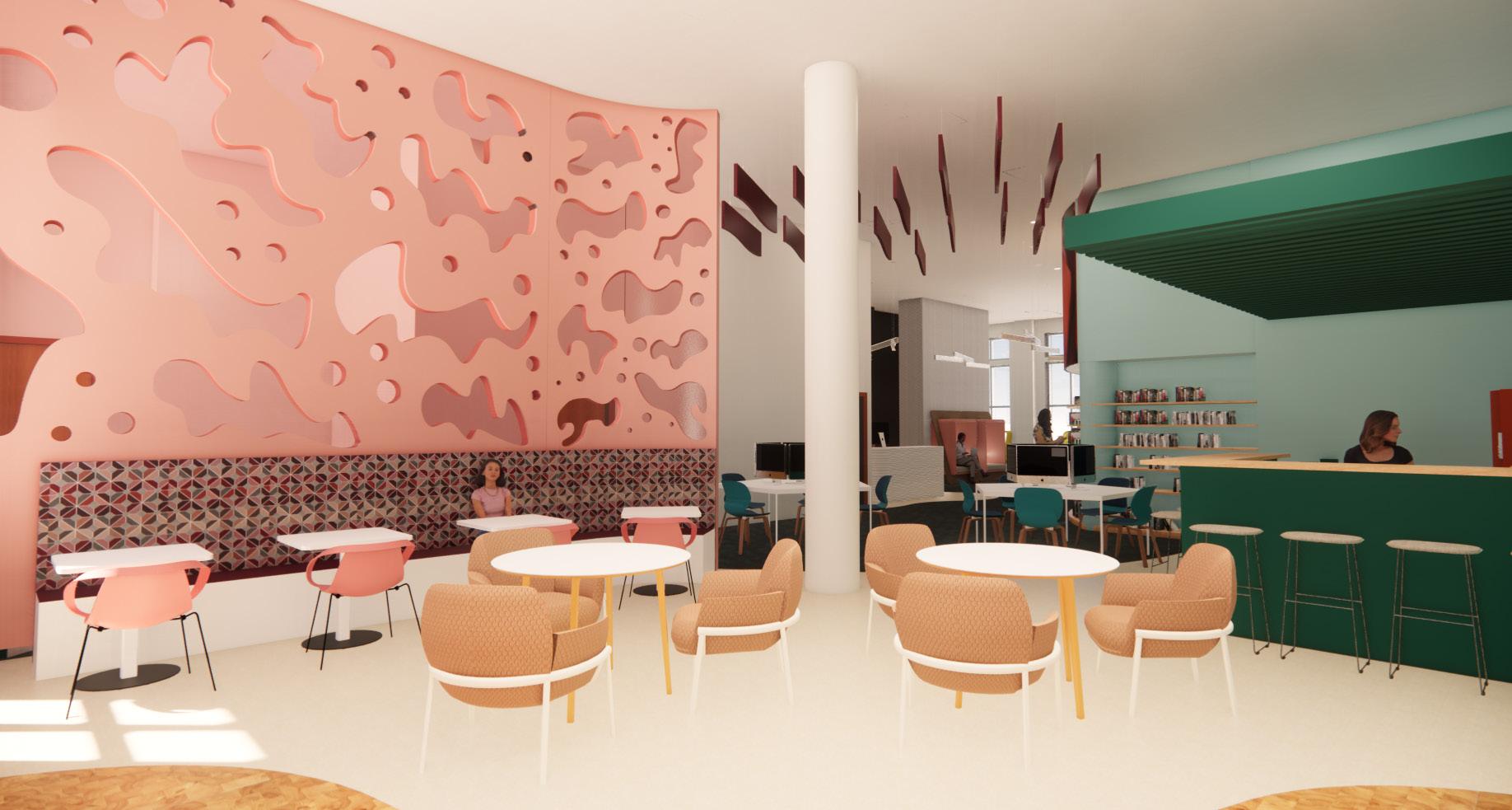 The pink wall has voids filled with colored glass to allow staff members at the cafe pergola to still keep an eye on users in the Media Space on the other side of the wall, given the few sight lines to the area.