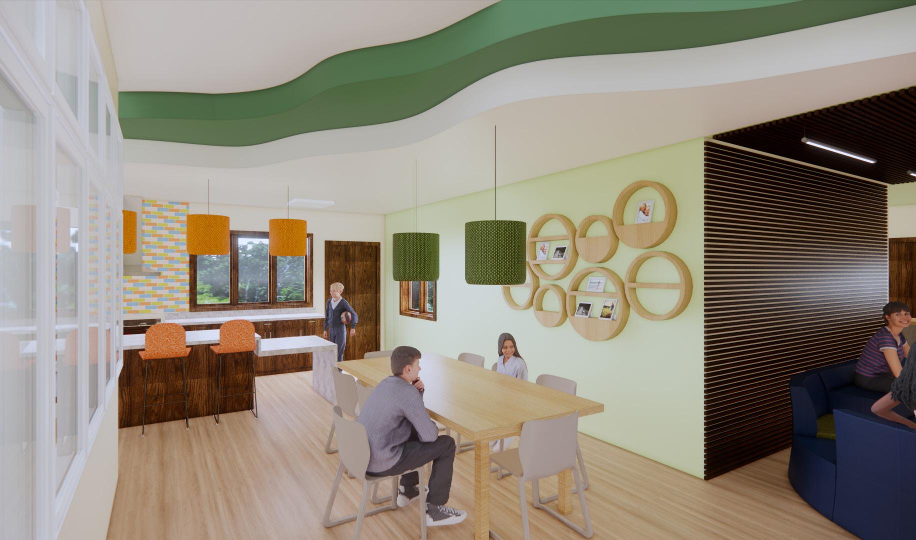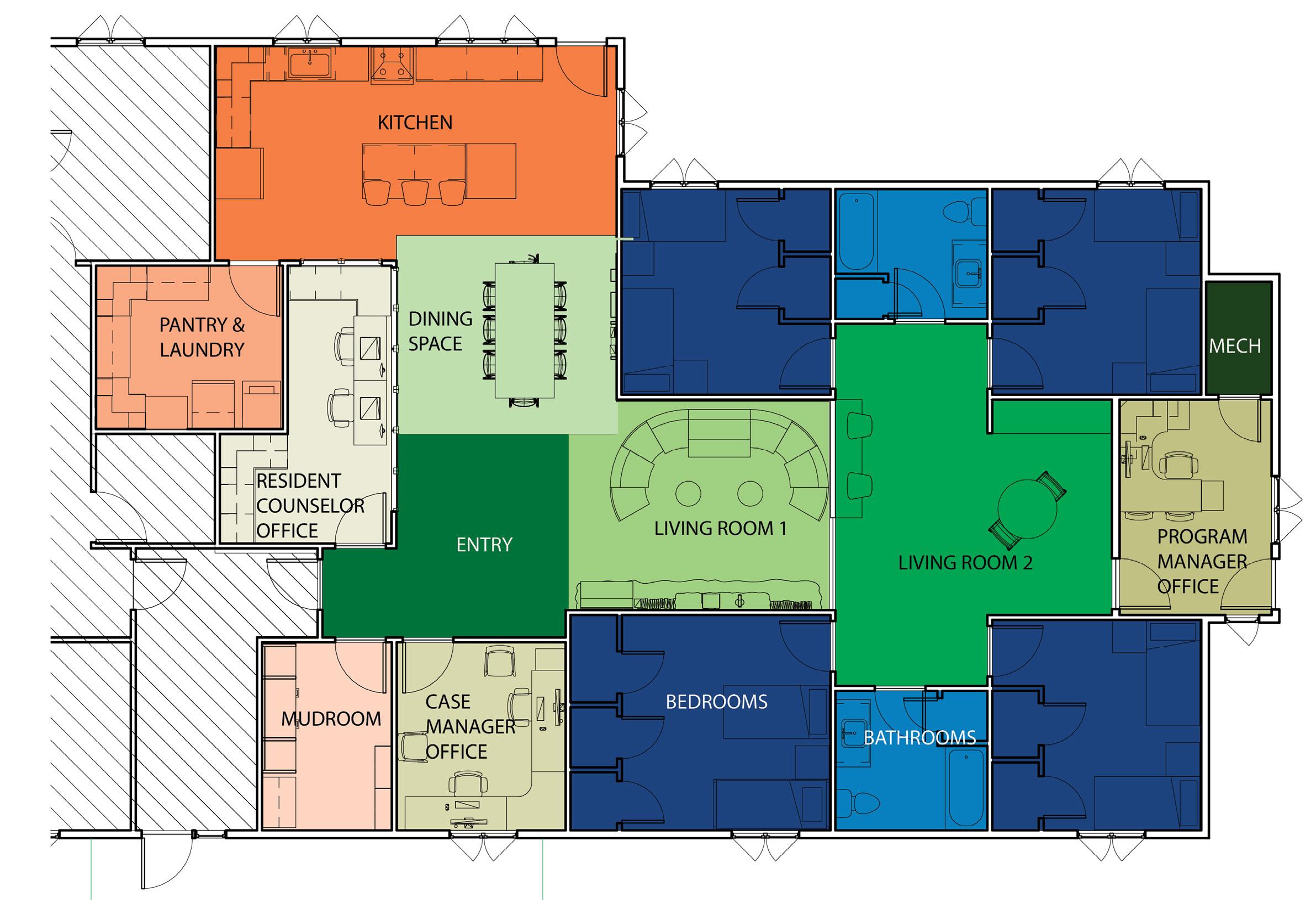 Their current space is outdated, run down, and not spatially arranged for optimum use. The goal of this renovation was to keep as much of the space untouched as possible as residents need to live in the facility during renovation. Additionally, offices needed to have as much supervision to the common spaces as possible, and fixtures should be tamper-proof, and finishes need to be durable and safe for a behavioral health facility.
