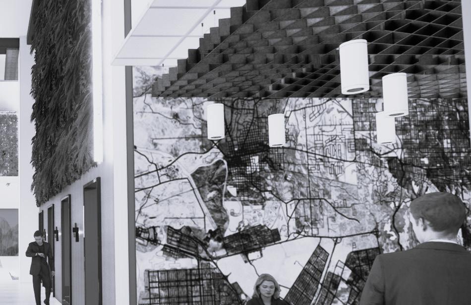 The 14, 303 SF space draws inspiration from the built environment of Dallas while also tieing in natural elements to meet the psychological benefits that derive from both the built and natural environment.