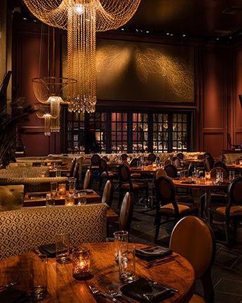 The dining area reflects the classic fine dining experience through warm, layered lighting, rustic materials, and intimate seating.