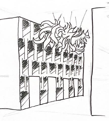 With one side exhibiting wood planks and lights that span the wall like a skyscraper, it reminds users of the power of innovation. Oppositely, the green wall towers over users to bring a grounded sense like being beneath a tree. Having this element placed in the entry and exit space, bring a marriage between built and natural environments for all users to ponder.