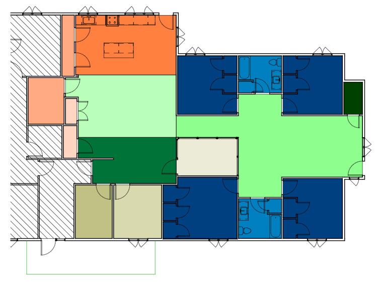 Space planning for this building was based on noise control; grouping the noisier activities on the left side of the space with the more independent, quiet spaces on the right.