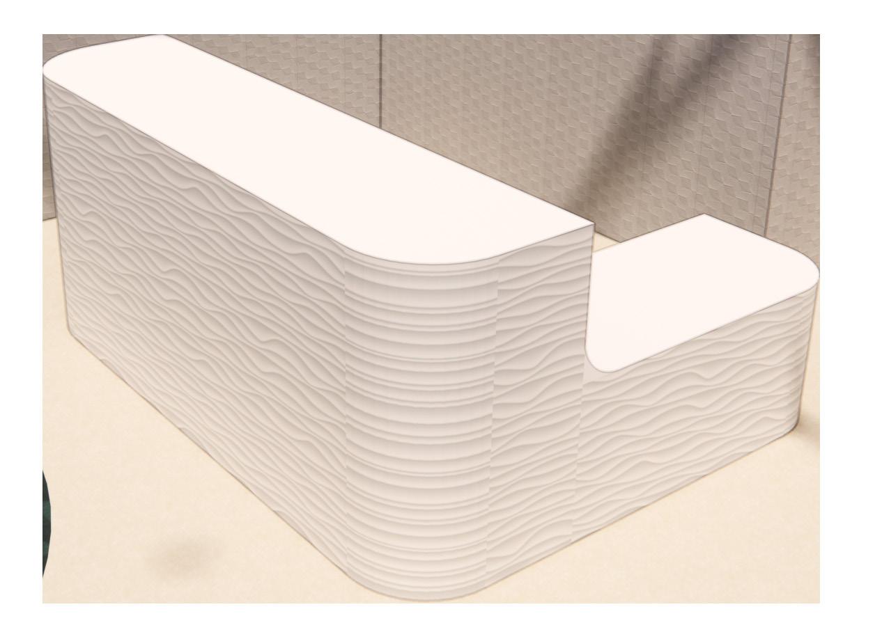 The solid surfacing material texture is intended to mimic the curvature of the flooring design and the other organic masses and shapes throughout the space.