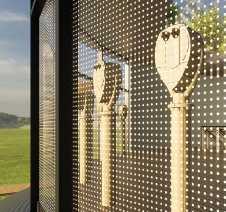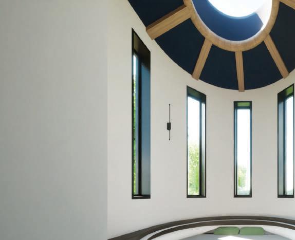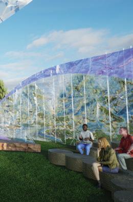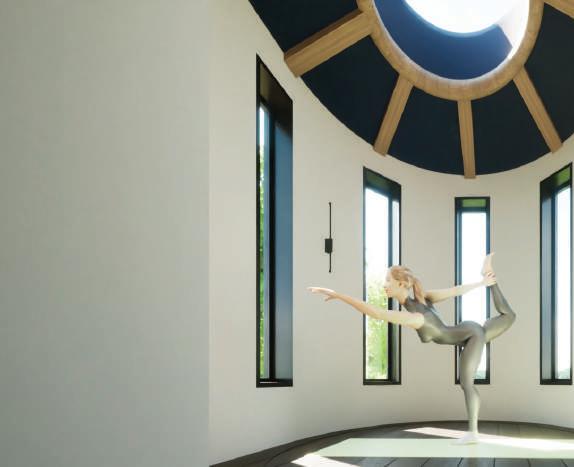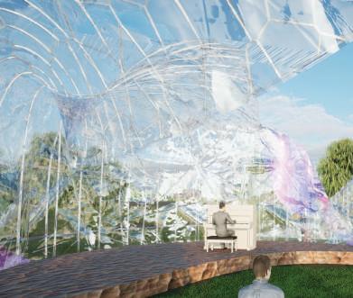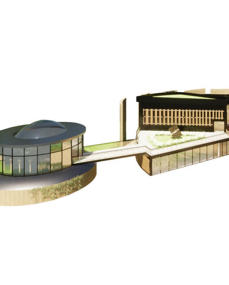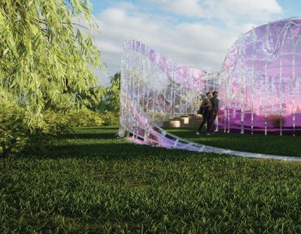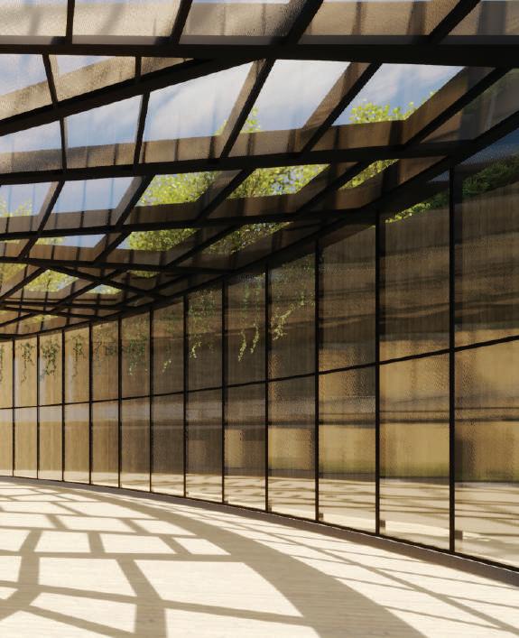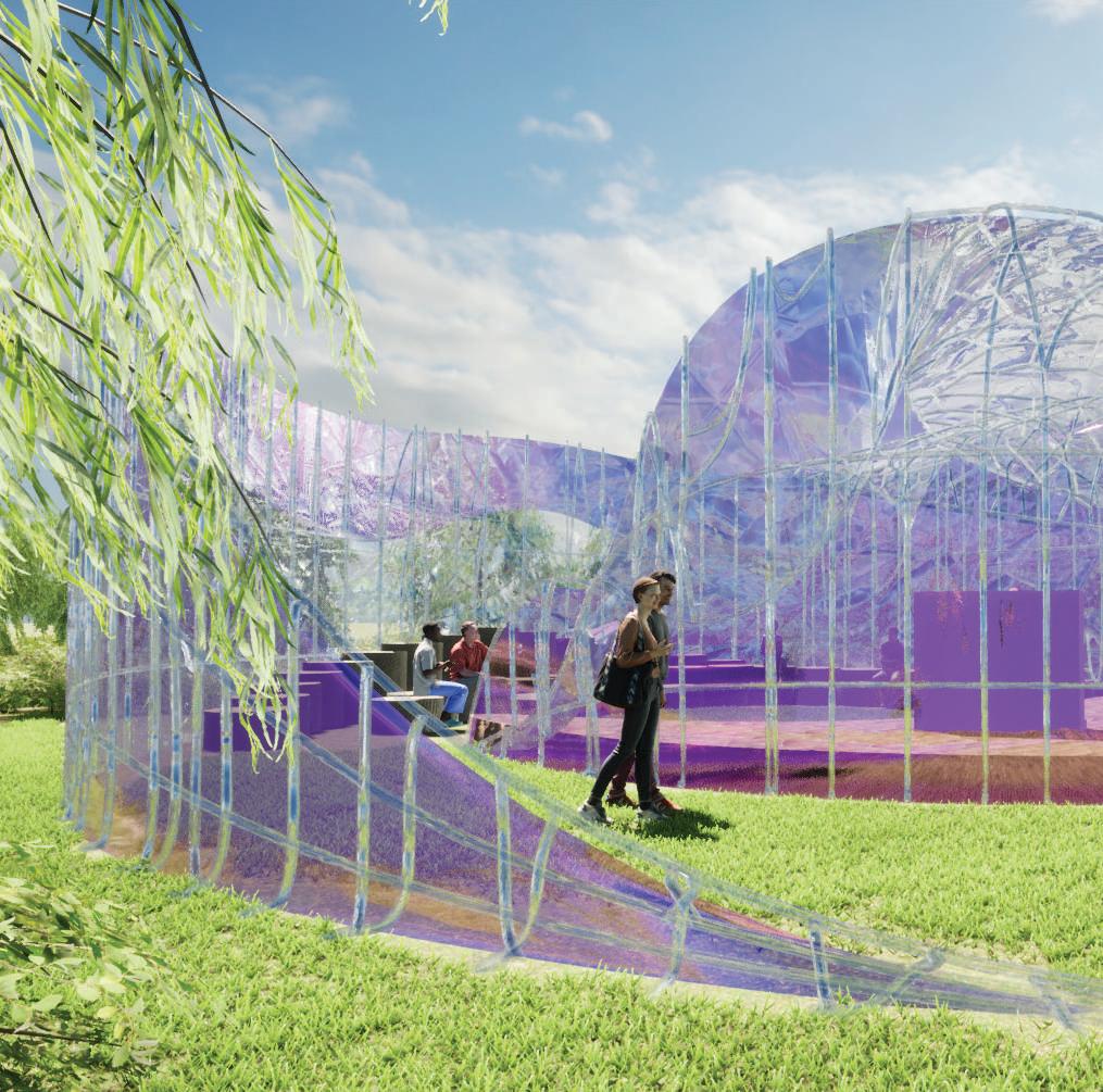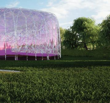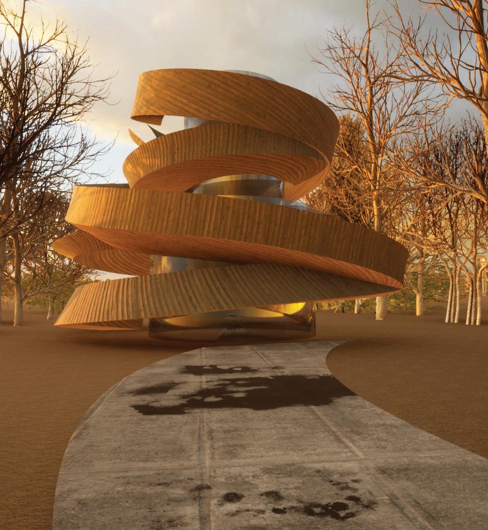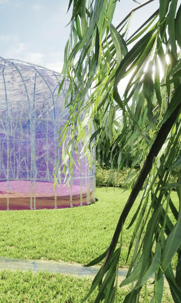 Submerge yourself in tranquility with this secluded pavillion. Made of galvanized steel and tinted glass. It provides calm stability while promoting peace, creativity, and ambition. The use of colours add a magical twist through the irridecent voilet tinted glass, creating an experience in itself. The spirial reminds us to connect oneself with our environment while enabling the glow that reflects off this structure allows you to tap into your crown chakra and inner conciusness. This pavillion is to be used as a small entertainemnt place, a place to relax, unwind or study.