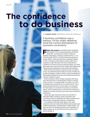 rom the chaos surrounding Brexit to stagnating global growth, it’s no surprise businesses are feeling pessimistic. According to the Office for National Statistics’ latest figures, business investment fell by 1.1% in the third quarter of 2018 – the third consecutive quarter-onquarter decline. Other signs that show companies’ appetite for risk is shrinking include refusals to offer credit terms to customers in high-risk sectors from fear of bad debt and reluctance to commit to resource-intensive projects. Yet, those that hunker down until the economic weather has settled could find themselves looking back on this period with frustration. While we all know growing a business involves an element of risk, we sometimes forget a safety at all costs mentality can be just as damaging. However, there’s a way for businesses to both protect themselves from the risk of a financial shock and have the confidence to grow. Credit insurance is often wrongly associated with being risk-averse but this is a misconception Coface is working hard to overturn. As a global leader in the field, our role is to facilitate trade and growth for our 50,000 clients. This is partly possible because our policy holders are protected from the impact of a customer’s insolvency or protracted default, which provides peace of mind and the reassurance needed to use sales revenue to pre-order stock and trade on credit terms. Coface also helps clients focus their time and effort on financially healthy customers, given it only takes a few moments to check our database of 80 million companies and learn whether a prospective customer is creditworthy. This supplement will shed further light on how credit insurance works and makes all the difference for dynamic and ambitious businesses, including those in volatile sectors. We hope you find it an interesting read but more importantly, we hope it inspires you to use credit insurance as part of your growth strategy.