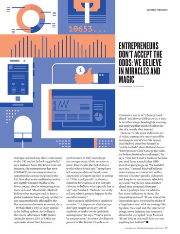 Commerce warns of “a bumpy road ahead” and slower GDP growth, it may be worth startups heeding his warning and applying that pinch of salt to the rim of a tequila shot instead. However while some indicators are of value, startups are rarely put off by doomsayers and it’s for this reason that Medved describes himself as “mildly bullish” about Britain’s future. “Entrepreneurs don’t accept the odds: we believe in miracles and magic,” he says. “You don’t start a business because you read from a pundit that GDP growth is going to go up. We couldn’t care less.” Instead, Medved believes most startups are concerned with a mixture of sector-specific indicators and long-term metatrends, which he says look “maybe ten times further ahead than economic forecasts”. So is it perhaps time we added a few extra indicators in there, like innovation indexes? “If you look at the innovation cycle, we’re in the midst of a huge boom and, with technology like big data, the cloud and the internet of things, every industry has been or is about to be disrupted,” says Medved. “If you look at that stuff, how are you anything but bullish?” JANUARY 2017 ELITEBUSINESSMAGAZINE.CO.UK