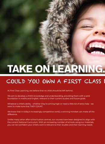 COULD YOU OWN A FIRST CLASS L At First Class Learning, we believe that no child should be left behind. We aim to develop a child’s knowledge and understanding, providing them with a solid foundation in maths and English, relevant to their current studies and future goals. Whatever a child’s ability - whether they’re aiming high or need a little bit of extra help - we want to make sure that THEY COUNT. We know that in today’s increasingly competitive world, a winning mindset can make all the difference. Unlike many other after-school tuition centres, our courses have been designed to align with the current National Curriculum. With an increasing number of schools using our materials, you can be confident your child’s work is relevant to their studies and their learning needs.