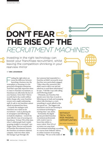 recruitment machines Investing in the right technology can boost your franchisee recruitment, whilst leaving the competition shrinking in your rearview mirror BY ERIC JOHANSSON