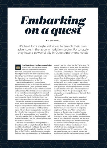 manager and pay a franchise fee,” Weisz says. “We sign up the developer on the basis that it will be a Quest, which gives the developer their spending – say £10m, £20m or £30m – for developing an asset and the franchisee manages it but with the support of the Quest brand sitting behind it.” A massive benefit of this system is that it doesn’t restrict entrance into the hospitality sector purely to those with an extensive property portfolio or many assets to leverage. “If you wanted to run your own aparthotel, no one’s going to invest that sort of capital unless you’ve got a very strong balance sheet,” says Weisz. “We give them a path where other paths to owning a business of that scale don’t really exist.” Perhaps one of the biggest endorsements of the model Constantinou had hit upon was that many of his initial franchisees were his own members of staff. “We had a lot of people at Quest corporate offices sign up for a deal; a lot of the first businesses were owned by ex-corporate employees,” Weisz says. “They worked in the business so they knew the benefits of owning the franchise.” However, once its pool of initial franchisees hit ten, Quest decided the foundations were in place for significant growth and it started to actively court prospective franchisees through the franchise press and by holding seminars. And this helped validate Constantinou’s vision of effectively democratising ownership of aparthotel businesses. “It’s proven to be really successful because you get people who are not just from a hospitality background: you get people