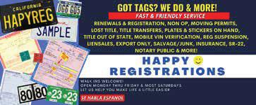 iSE HABLA ESPAÑOL! OPEN MON-SAT iSE HABLA ESPAÑOL! OPEN MON-SAT iSE HABLA ESPAÑOL! OPEN MON-SAT 7 0 7 - 2 9 7 - 9 3 6 2 H A P P Y R E G I S T R A T I O N S . C O M 5 0 5 E P E R K I N S S T . U K I A H , C A 9 5 4 8 2 GOT TAGS? WE DO & MORE! GOT TAGS? WE DO & MORE! GOT TAGS? WE DO & MORE! FAST & FRIENDLY SERVICE FAST & FRIENDLY SERVICE FAST & FRIENDLY SERVICE Vehicle Registration HAPPY SCAN TO STAY CONNECTED VEHICLE REGISTRATION Happy Registrations LLC 505 E Perkins St, Ukiah happyregistrations.com 707-297-9362