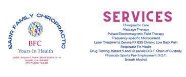 110 # A A Sweet Affair 22 A To Z Construction 47, 49 A Touch of Glass 60 AC&R Services Heating & Cooling, Inc 58 Action Sanitary, Inc 46, 47, 56, Back Cover Adventist Health Howard Memorial 73 Adventist Health Mendocino Coast: Emergency Room 72 Aesthetics by Ashley 64, 66 All In One Auto Repair & Towing 102, 103 Anello Tax Service 19 Angry Baker 26 Anne Martin-Ko MD 72 Aqua Pool Co Pool & Spa 49 Armed Force Pest Control, Inc 1, 36, 52, 53 B Badass B L T ’s 27 Barbecue By Biasotti 23, 24 Barr Family Chiropractic 71 BAS Roofing Inc 56 Beauty Within 64, 65 Bell Haven Flower Farm & Resort Cover, 13, 33, 37 Bess Donley L A C , Women’s Integrative Health 70 Better Homes and Gardens 15, 54, 59 Bicoastal Media 6 Big Earl’s BBQ 23, 24, 25, 27 Black Oak Coffee Roasters 25 Blue Ribbon Pets 38, 39, 85 Blue Wing Saloon Restaurant 29 Body Glow Tanning Boutique 36, 66, 79, 85 Bonterra Organic Estates 106, 107, 108 The Bottle Shop Deli 30 Brassfield Estate Winery 106, 107, 108, 112 Broiler Steak House 31, 32 Busch Home Theater 48 C C&M Self Storage 40 Cache Creek Vineyards 8, 105, 107 Cali Mobile Detail 98 Cannavine Dispensary 80, 81 Carlton Cooper Tires, Inc 100 Carpet Man-Floors To Go 46 Carreker Plumbing 52 CARSTAR UkiahYokum’s Body Shop 90, 96, 102 Chadwick Armory 83 Chapel of the Lakes Mortuary 37 Cloud Chem-Dry 45 Coast Hardware True Value 48 Comcast 18 Comfort Air 44, 54 Comfort Air Heating/Cooling 60 Community First Credit Union 16 Corbett Orthodontics 74 Country Air Properties 18, 19 Cowlick’s Ice Cream 28 Coyote Valley Casino 8 Craftsman Estate Jewelry 13, 84 Cristina Castaneda, JSP & Associates Insurance Services, Inc 37 Cultivo 28 D Dave’s Bike Shop 78 Day Chiropractic 71 Deep Valley Security 48 Defatte Equipment Rental 46 Dr Steven C Wirth, MD 72 Dr William Tom DDS 74 E El Azteca Restaurant 28, 29 Ellie’s Mutt Hut & Vegetarian Cafe 26, 29 Ellis Ranch 45, 52 Emerald Triangle Glassworks 86 Eric’s Oil Change and Repairs 92, 98 Essential Audio & Video Rental 48 Eversole Mortuary 34, 37 Ewing & Associates 16 F Family Tree Service, Inc 40, 41, 60, 61 Farmers Markets Friday Night 12 Ferreira Family Fight Academy 64 Fidelity National Title Company 58 Fleeky Beauty 66 Forks Ranch Market 84, 85 Fowler Auto Center 92, 93, 94 Frey Vineyards Winery 106 Friedman’s Home Improvement Ukiah 48 Furniture Design Center 47, 50 G George Petersen Insurance Agency 38 GI Joe’s Outdoor Store 83, 86 The Golden Pig Wine Shop 84 Good Eats ‘N Treats 26 Grace Church Kelseyville 36 Granite Construction Co 44, 46 Granite Construction Company’s Annual Chili Cook Off 8, 9 Green Heron Dispensary 82, 87 Griffin’s Furniture Outlet 47, 50, 51 Gunnink’s Harley-Davidson 98 Guy Strohmeier’s Auto Center 94 H Happy Days Preschool 36 Happy Garden 22 Happy Registrations LLC 102 Henry Home Inspections LLC 48 Henry Repairs 44 Heritage Mendocino 80 Hernandez Electric Inc 46, 54 Hidden Valley Lake Golf Course 12 High Country Security 48 Hospice of Ukiah Inc 73 Hospice Services of Lake County 73 Humane Society for Inland Mendocino County 38 Humberto’s Roofing 49, 56 Hydropacific Garden Supply Store 47 I Immediate Care: Adventist Health Mendocino Coast 76 Infinity Consignment Boutique 82 Intensity Cheer Elite 10, 78 J J Robert Ortega, DDS - Mendo Smiles 71 J’s Customs 98 Jaxon Keys Winery & Distillery 27 Jay Epstein - State Farm Insurance Agent 37 JD Redhouse & Company 85 Jessica Spencer, Better Homes & Gardens Real Estate Wine Country Group 54, 55 Joe A Vargas, OD 74 John Chan Plumbing Inc 52 Johnson’s Quality Tree Care 60 Jonas Energy Solutions 58 JSP & Associates Insurance Services, Inc 38 Judy’s Junction 20, 23 JW Electric 46 K K & T Rising Doors 47 Karen Pavone Photography 39 Kelsey Creek Storage 40 Kelseyville Appliance 43, 44 Kelseyville Lumber & Supply Co 60 Kingdom Games 13 Konocti Bicycles 78 Konocti Computers 15 Konocti Vehicle Registration 102 Kure Wellness 82 KXBX Summer Concert Series 7, 11 KXBX98 3 FM 100 L La Chilanguita Mexican Restaurant 28 Labels Recycled Fashion 82 Lake County Broadband Solutions 18 Lake County Coating 96 Lake County Pumpers 56 Lake County Tribal Health Pediatrics 75 Lake Dermatology Medical Associates 71, 73 Lake Event Design & Party Rental 38 Lake Orthodontics 74 Lakeport Cinema 5 13 Lakeport Dance Center 10 Lakeport Flowers By Jackie 37 Lakeport Nail Spa (Lakeport Beauty Bar) 66 Lakeport Tire and Auto Service 36, 88, 89, 96, 98, 100 Lakeview Supermarket & Deli 85 Law Office of David M Kindopp 16, 17, 18 Law Offices of J Chrisp 16, 18 Leah Sheridan Photography 39 Left Coast Seafood & Marketplace 24, 27, 30 Lillian’s Medical Spa 73 Little River Inn 12 The Living Canvas Tattoo 40 Locals Barber + Salon 64 Long Valley Health Center 73 Lorena Watson FNP 72 Lucerne Euro Market & Bistro 28, 30 Lyndall’s Sports Stop Grill 31, 32 M Mac Nab’s Men’s Wear 84 Main Street Gallery and Lake County Arts Council 8 Main Street Music & Video 85 Malley’s Rallys 96 INDEX