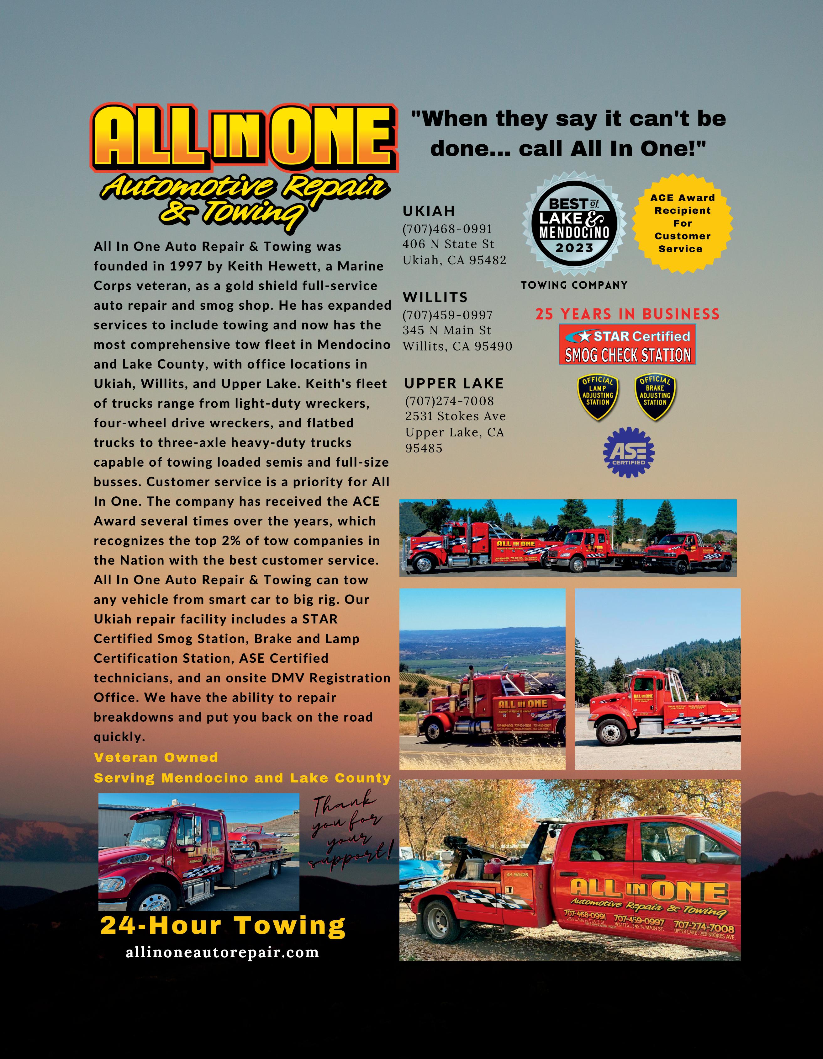 All In One Auto Repair & Towing 406 N State St, Ukiah allinoneautorepair.com 707-468-0991 2023 2023