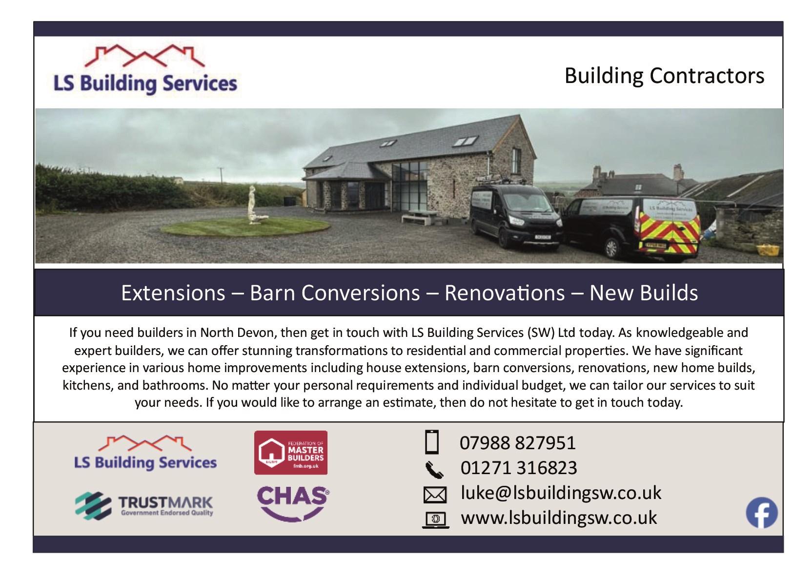 To advertise call 07561 890 588 or email mag@ex33.co.uk 60 Whether you’re adding new or maintaining existing: Small Building Jobs / Garden Walls Brick/Block/Stone Work Fencing Patios/Steps/Paths Plastering internal/external Power Washing Micro Digger available No Job Too Small Friendly, Reliable and Reasonable Service Call Jamie for a free quote on 07478 275676 Williamsbuildingservices@outlook.com