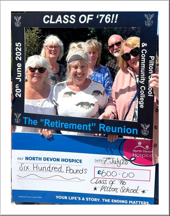 Over 50 ex-pupils of Pilton School attended a long overdue reunion earlier in the year and managed to raise £600 for North Devon Hospice.